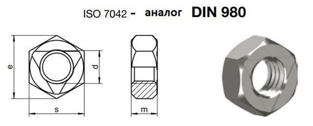 - Особливістю шестигранної гайки по din 980 є, то що для кріплення не потребує додаткових коштів, метиз з розряду самостопорящихся.